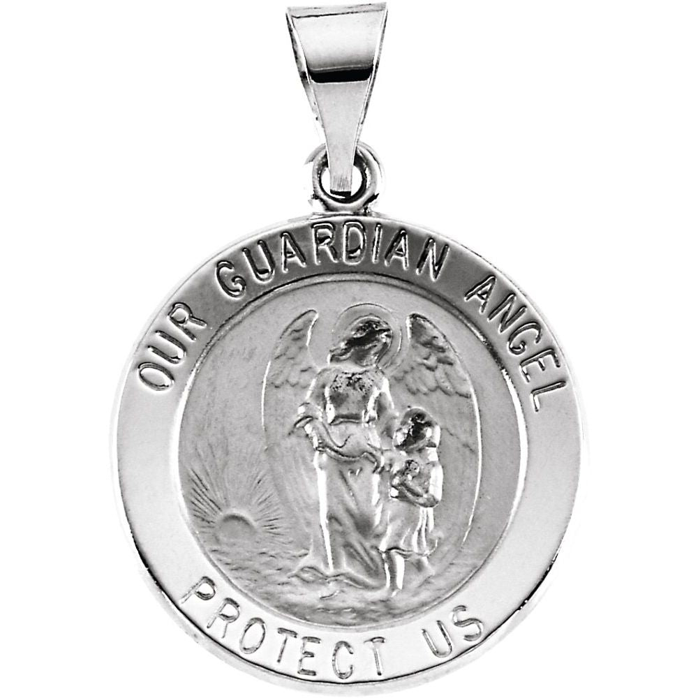 Description: 14k White Gold 18mm Hollow Round Guardian Angel Medal