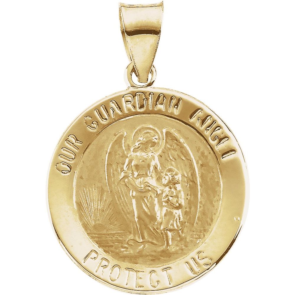 Description: 14k Yellow Gold 18mm Hollow Round Guardian Angel Medal