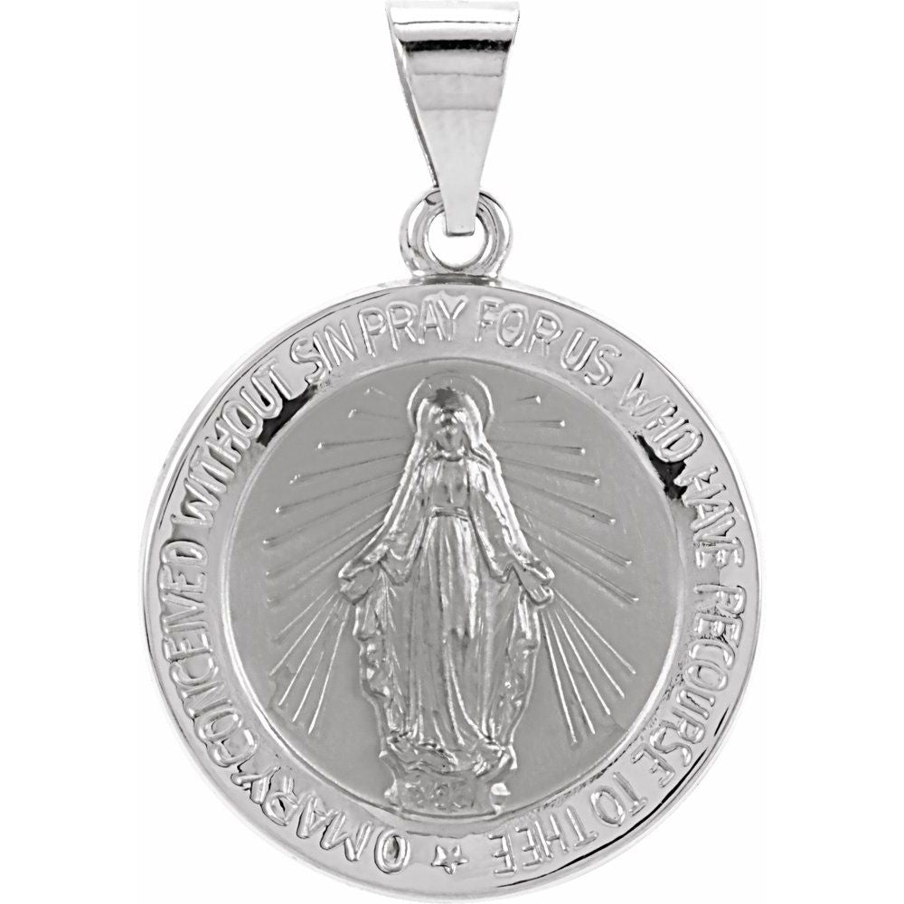 Description: 14k White Gold 18mm Hollow Round Miraculous Medal