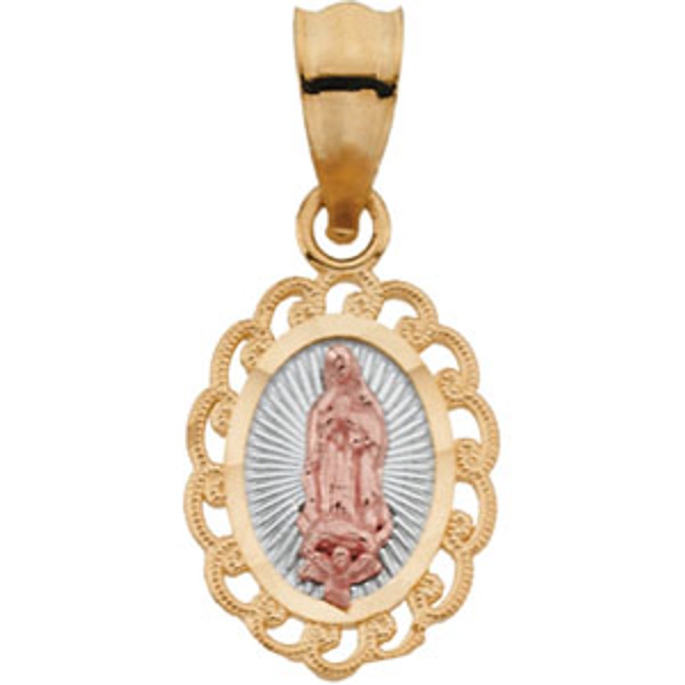 Description: 14k Yellow Gold/Rose 11x9mm Oval Our Lady of Guadalupe Pendant with Rhodium Plating