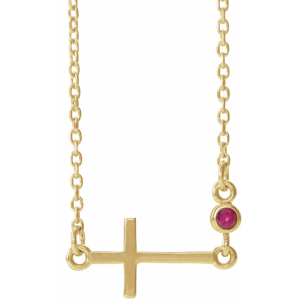 Description: 14k Yellow Gold Lab-Grown Ruby Sideways Cross 16-18" Necklace