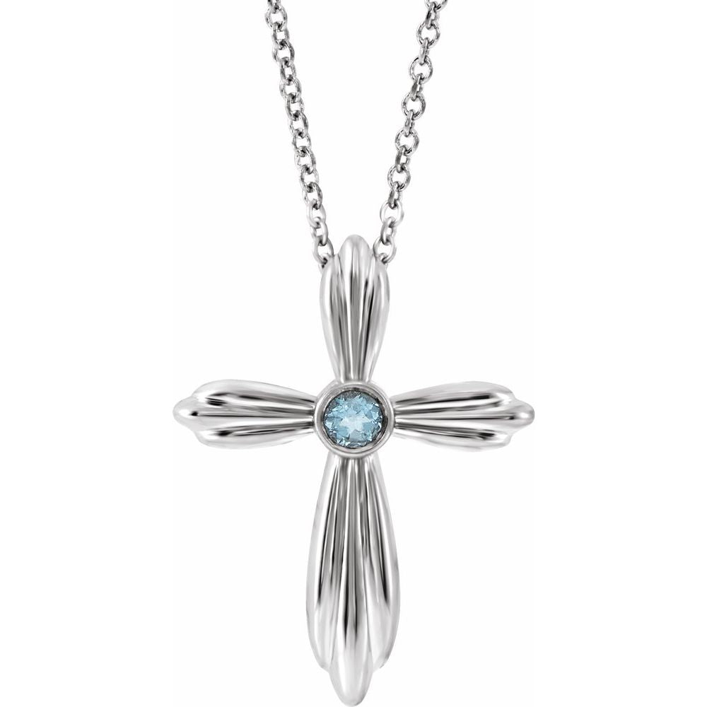 Description: Platinum Aquamarine Cross 16-18" Necklace