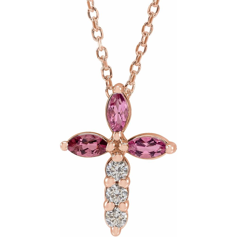 Description: 14k Rose Gold Pink Tourmaline and 1/10 cttw Diamond Cross 16-18" Necklace