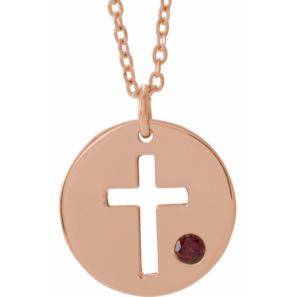 14k Rose Gold Round Shape Garnet Pierced Disc Religious Cross Necklace (13.6x11.9mm), 16-18"