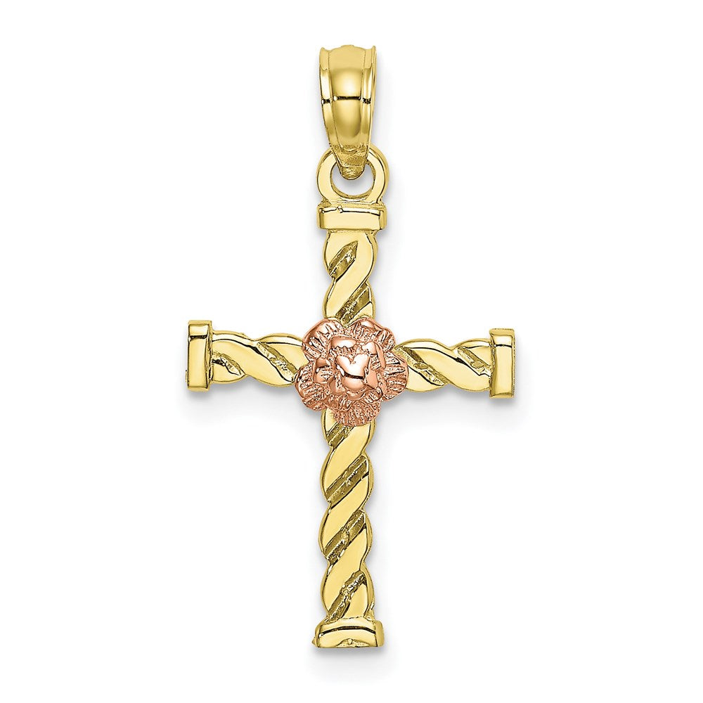 10k Two Tone Gold Twisted Cross With Flower Charm Pendant