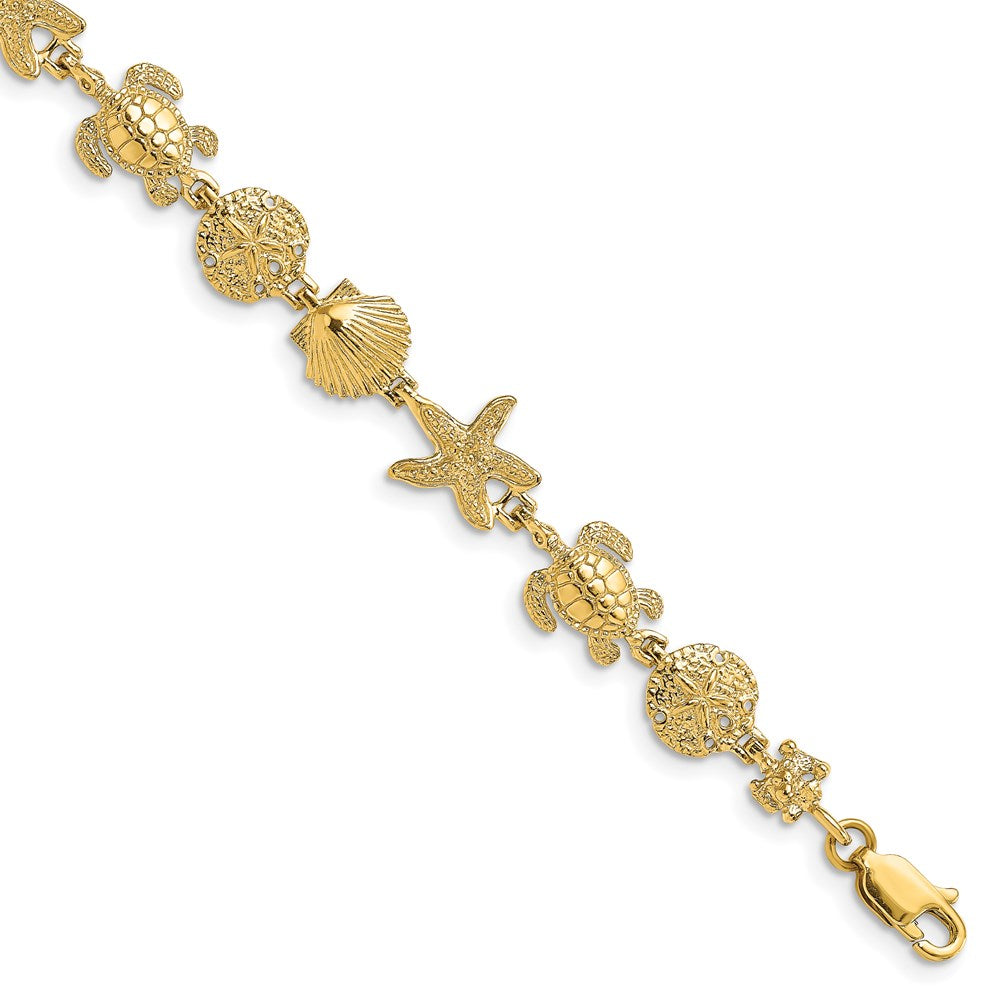 14k Yellow Gold Turtle, Sand Dollar, Shell and Starfish Link Bracelet, 8"