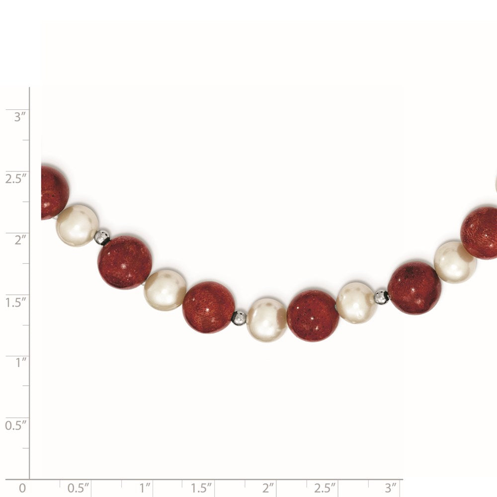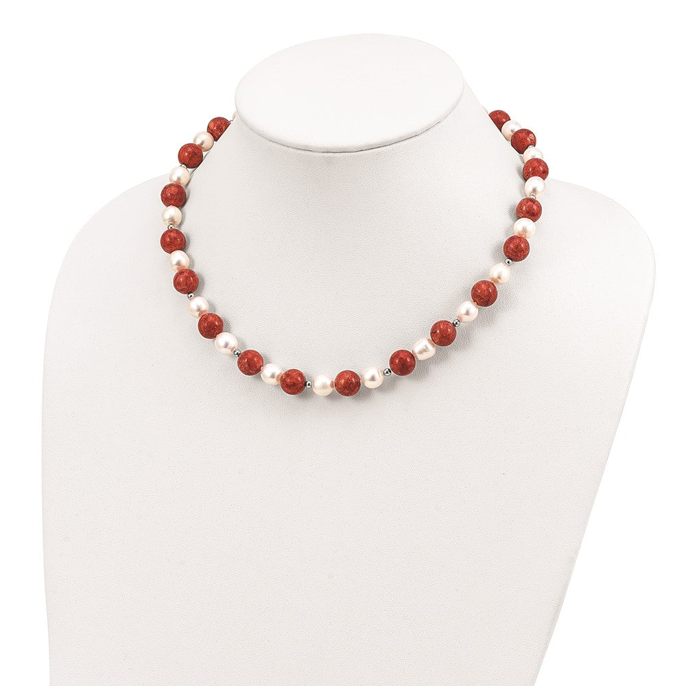 925 Sterling Silver Freshwater Cultured Pearl and Stabilized Red Coral Necklace, 18"