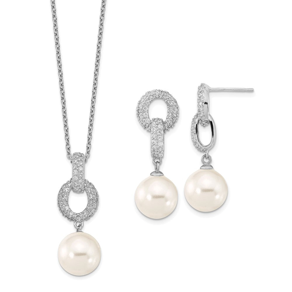 925 Sterling Silver White Imitation Shell Pearl and Cubic Zirconia Earrings and Necklace Set (10-11mm), 17"