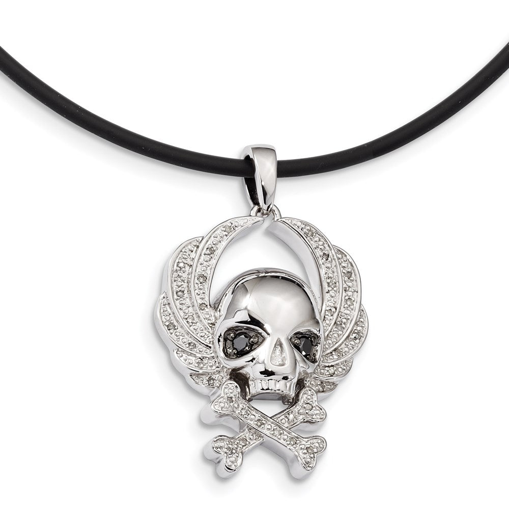 925 Sterling Silver White and Black Diamond Skull Pendant with Rubber Cord