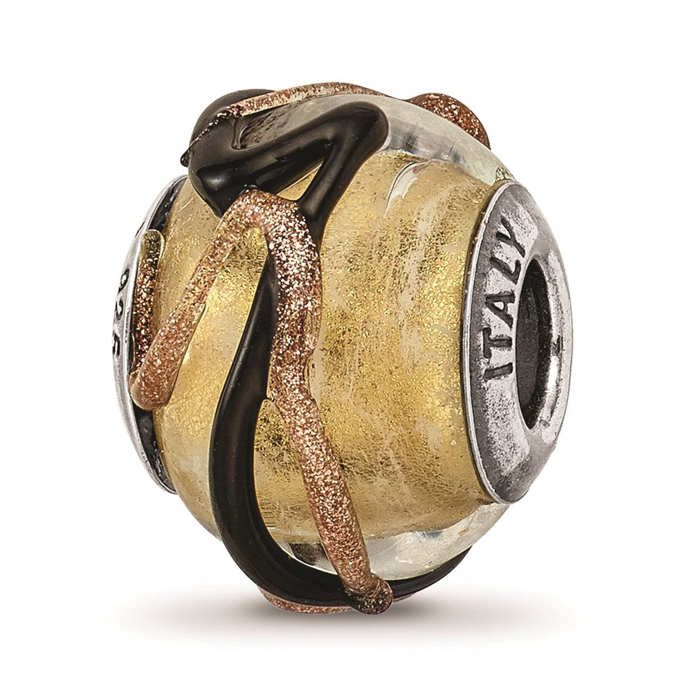 925 Sterling Silver Reflections Italian Yellow-ish Black/Brown Lines Glass Bead Charm Pendant