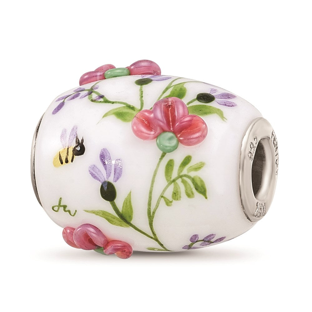 925 Sterling Silver Reflections White Hand Painted Floral Fenton Glass Bead Charm Pendant