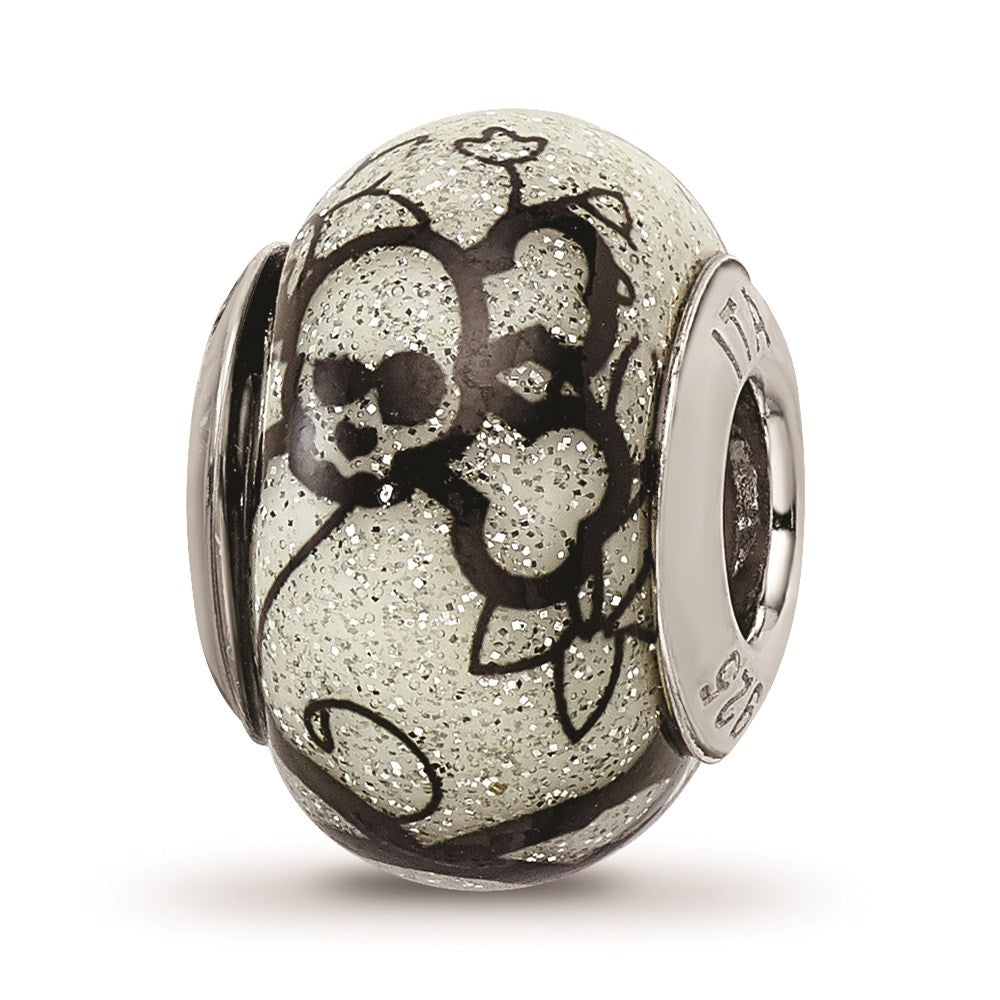 925 Sterling Silver Reflections Floral Skull and Bones White with Glitter Italian Glass Bead Pendant