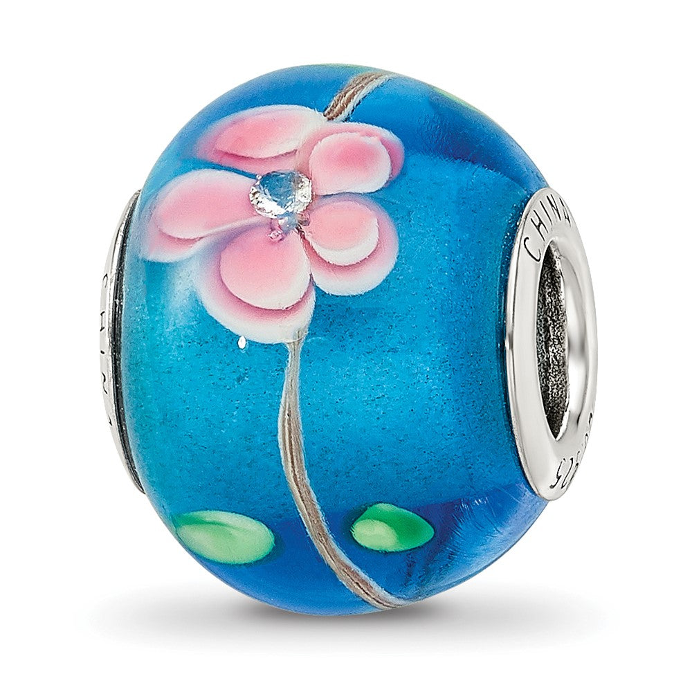 925 Sterling Silver Reflections Cubic Zirconia Blue and Pink Floral Blue Glass Bead