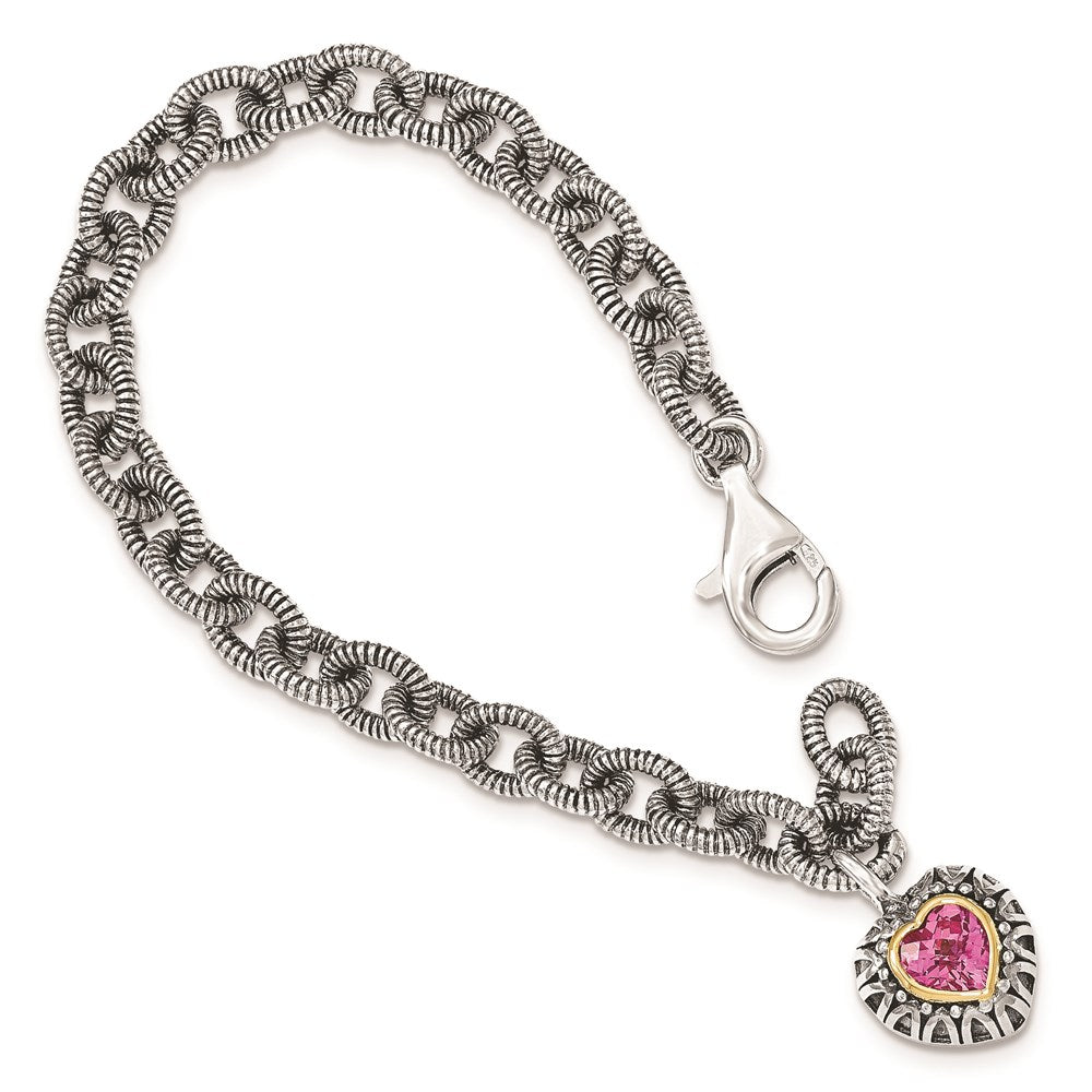 925 Sterling Silver and 14k Yellow Gold Created Pink Sapphire Heart Charm Bracelet, 7.5"