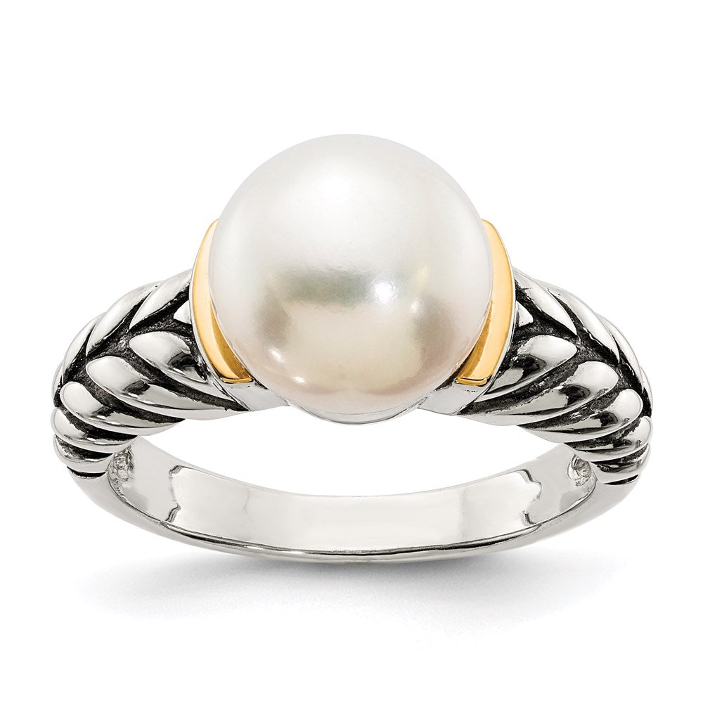 925 Sterling Silver and 14k Yellow Gold Button Freshwater Cultured Pearl Ring (1mm), Size 7