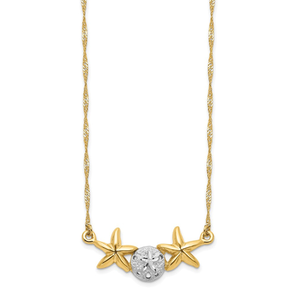 14k Yellow Gold and White Rhodium Plated Brushed and Polished Sand Dollar Starfish Necklace, 18"