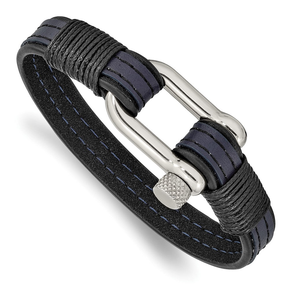 Men's Stainless Steel Black and Blue Leather Shackle Bracelet, 8.25"