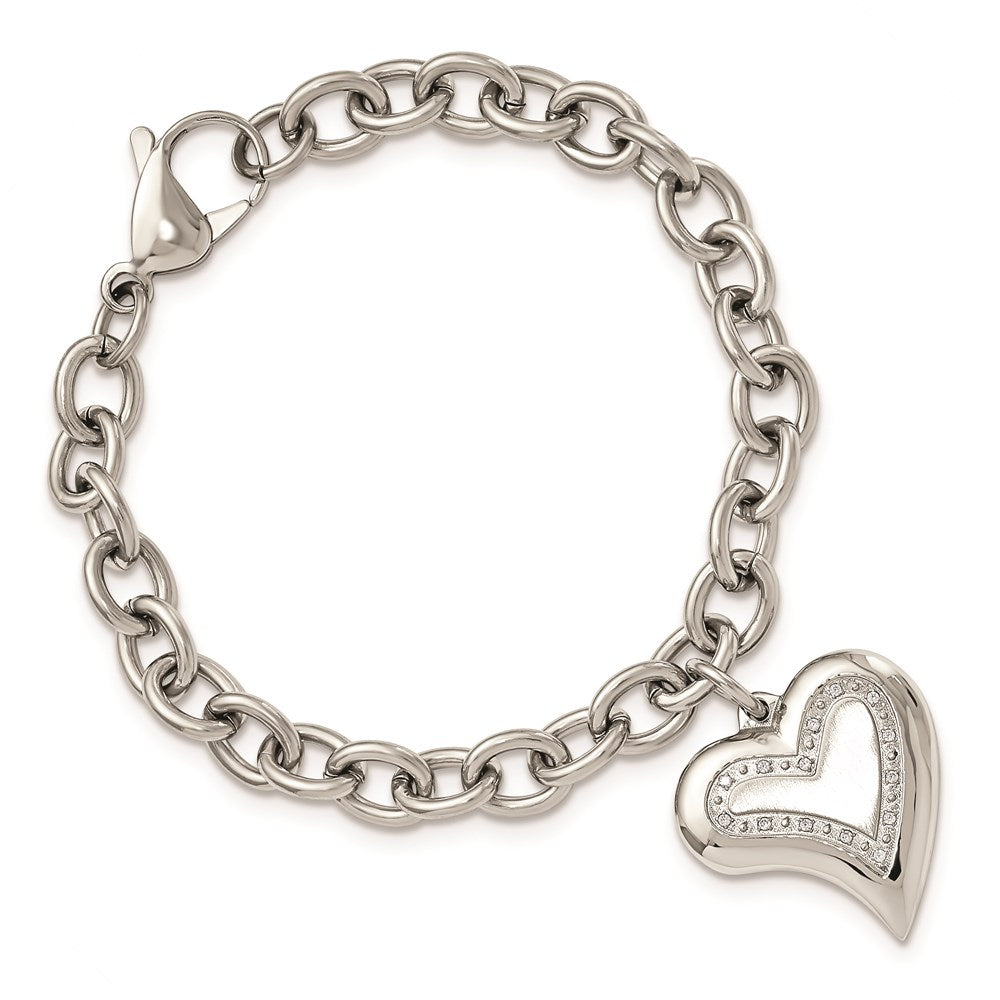 Stainless Steel Cubic Zirconia Heart Charm Fancy Bracelet, 7.5"