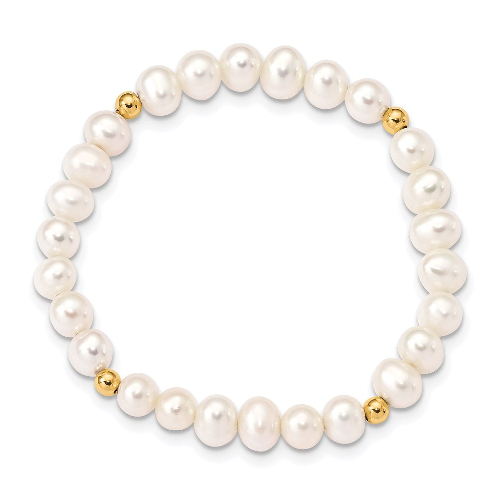 14k Yellow Gold White Egg Shape Freshwater Cultured Pearl and Beads Stretch Bracelet (4-5mm), 7"